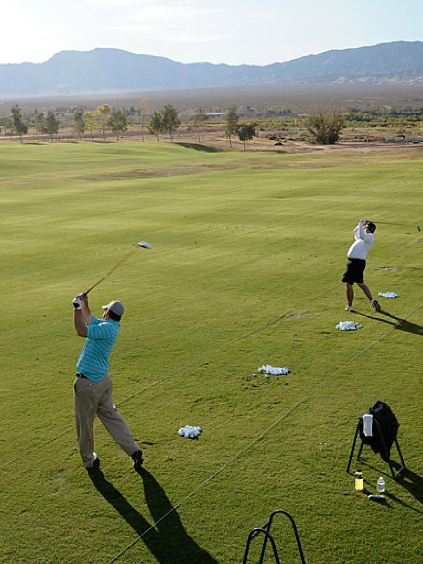 2. Have a range routine: Everyone wants to see how far they can hit a golf ball, but when you go to the driving range, resist the temptation to immediately start ripping drivers. Yes, you might crank a couple, but swinging for maximum distance will throw you out of sync -- and fast. Start out by hitting one of your wedges or short irons, warming up your golf muscles with half-swings. Then increase the length and speed of your swings, and move on to your middle irons. Work your way up to the driver, and after you hit some balls with it, go back to a short iron or wedge. This will help you keep your tempo and tension level in check. Read David Leadbetter's advice on warming up before you play.